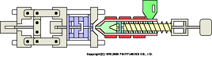 合模裝置是開閉模具以執(zhí)行脫模作業(yè),而且也有如圖所示的肘桿方式,以及利用油壓缸直接開閉模具的直壓方式。注射裝置是將樹脂予以加熱融化後再射入模具內(nèi)此時,要旋轉(zhuǎn)螺桿,并如圖所示讓投入到料斗的樹脂停留在螺桿前端,經(jīng)過相當(dāng)于所需樹脂量的行程儲藏後再進行射出。當(dāng)樹脂在模具內(nèi)流動時,則控制螺桿的移動速度并在填充樹脂後用壓力(保壓力)進行控制。當(dāng)達到一定的螺桿位置或一定射出壓力時則從速度控制切換成壓力控制。